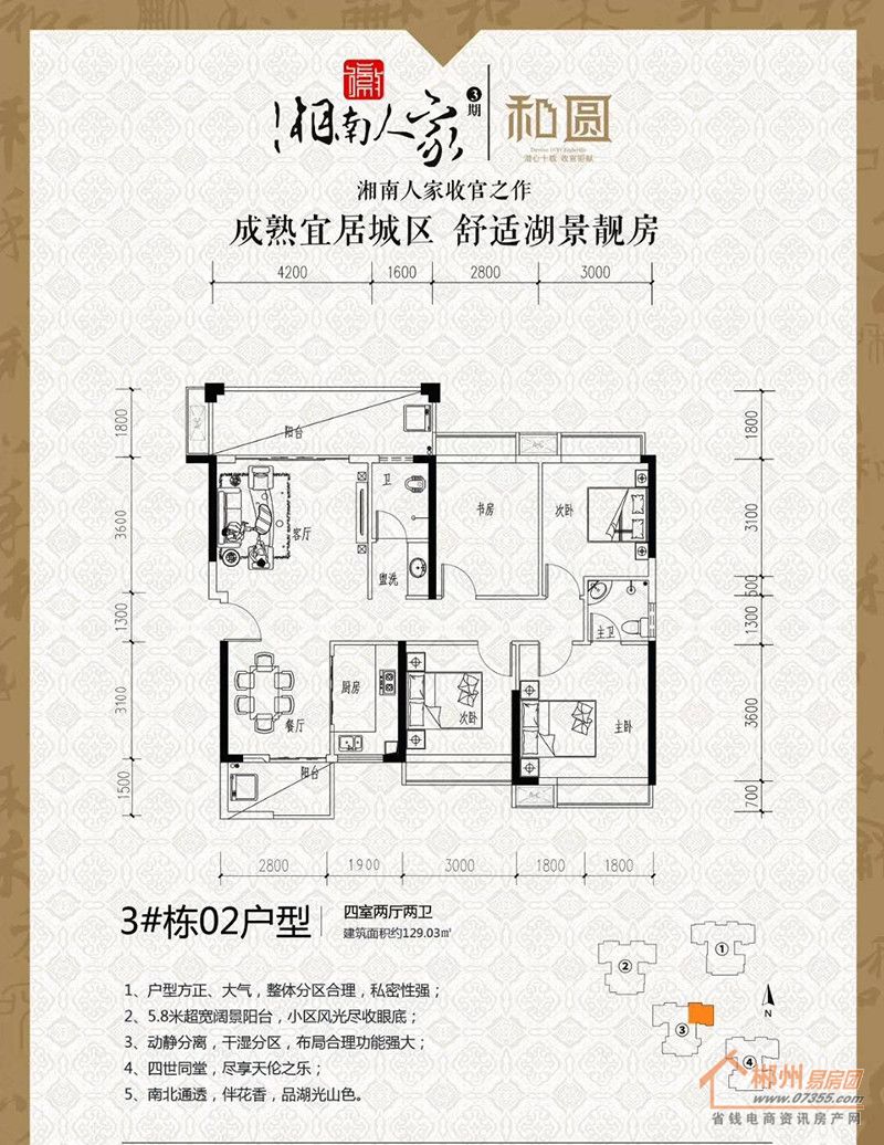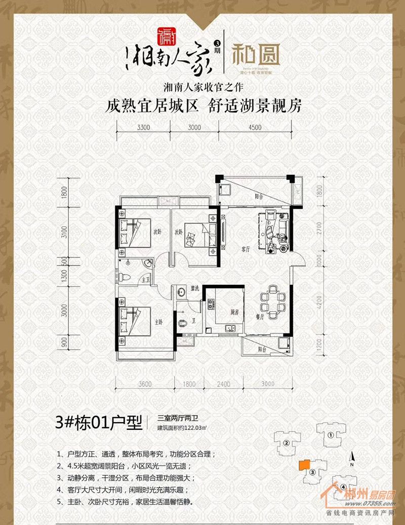 湘南人家·和圆以传统造园手法营造人文景观。入口处前庭过院院落式设计,首层架空5.8米,并配以花坛、休息坐凳,供住户就近享用,可让业主休闲娱乐于此。楼栋之间设计成园林中的内庭院,庭院绿地以草皮、灌木、花卉、水池为主结合蜿蜒的小径,展现院落生活文化。 竹林、小木桥、亭台楼榭、大块园石…质朴的东方元素,不是过多裁剪却蕴含着□特的人文思想。层层叠叠的假山坡地,蜿蜒曲折的小径和回廊,营造小区内休憩、交流的活动空间。使园林不会一览无遗地单调,而且符合陌生人游园时对面不对立,相逢不相冲的心理需求。 东方质朴而不失雅韵的园林涵养,自然而然的园林、有声有色的生活、和睦相处的心境、融合大家庭的情感。 项目整体的建筑风格特点 新式徽派建筑风格,传承徽派建筑精髓,创造生活的的人文性格,马头墙、双坡、半坡黛瓦屋□,传承中国之质朴,白粉墙与灰砖、窗框,构筑成一副中国水墨画;建筑立面简洁的玻璃装饰,融古典成时尚,让建筑在古朴与现代之间交融。中国式前庭院落式设计,合围而居的居住理念,粉壁、黛瓦、马头墙为主要表现。园林特色风格: 以自然为主,“虽为人作、宛若天成”。整体园林景观错落有致地置亭、施榭、设舫、筑台。结合地形的营造,使各景点高低错落、呼应有致。园林设计手法:在园林硬件的构思、设计上充分利用地形条件,营造怡人的景观。利用植物的季相变化,春赏傲梅、秋闻桂香、白墙竹影、雨打芭蕉…自然而然的园林生活。 以东方传统文化为依托,注重意境的营造。用简约、自然的元素体现深远的意境,表达人与自然和谐、简单、纯净的可以深掘出无穷的文化韵味。注重内庭景观与园区大景观的相互渗透。对居住业主具有一种潜移默化的沟通交流功能,美育及文化的熏陶功能,使景观设计结合各种构景要素营造出自然与人文结合的境界。